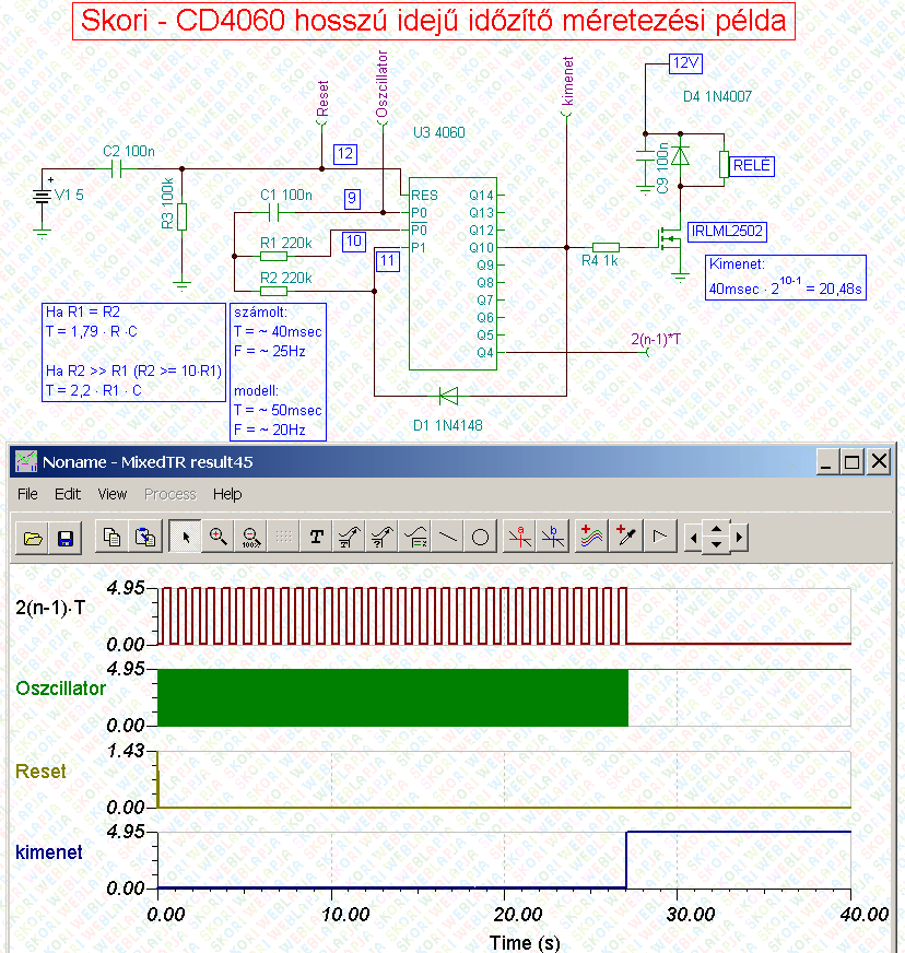 A kapcsolást a TINA9 áramkörszimulátorban teszteltem, a modell innen letölthető: CD4060.TSC