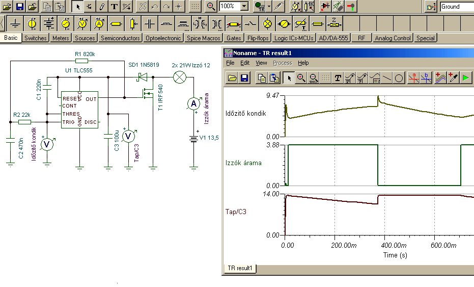 legelső perriódus hossza jelentősen eltérne a többitől). A C3 kondenzátort egy "biztonságosan nagy" értékre méreteztem,