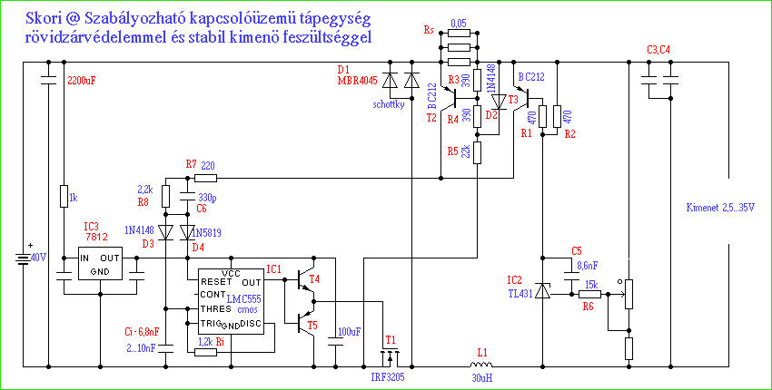 A fenti áramkör zövidzárvédett stabil 5V körüli kimenö feszültséget állít elö 7..18V-os bemenö feszültségböl.