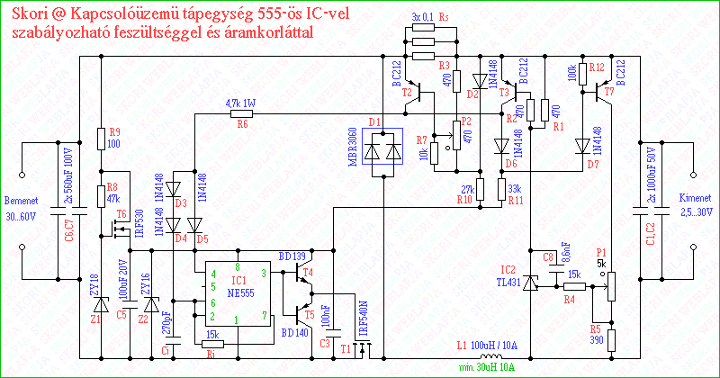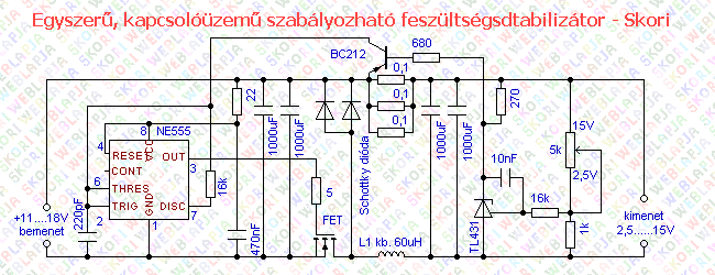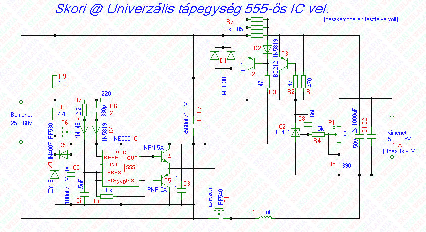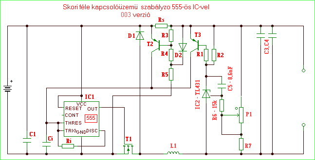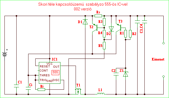 Az 555-ös IC-re épülö kapcsolóüzemü tápegység könnyen továbbfejleszthetö nagyobb be/kiemenö feszültségre és áramerösségre,