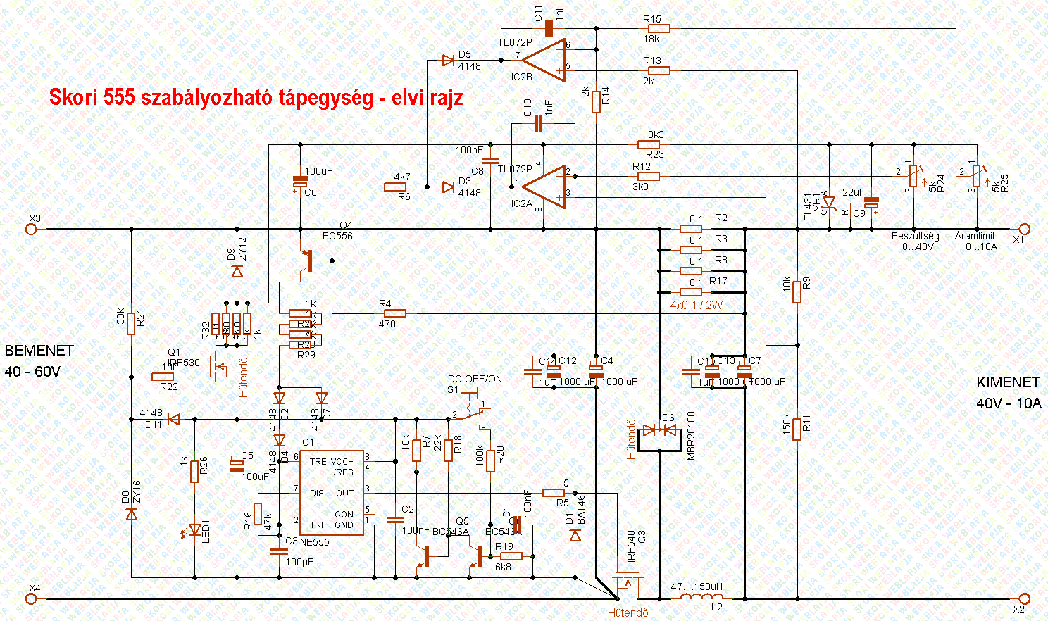 Tehát a lenti áramkör a korábbiaknál precízebb feszültség és áram szabályozással rendelkezik, és elméletileg 0-40V és 0-10A közötti kimenõ