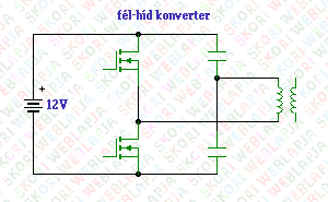 A félhidas megoldás hátránya, hogy a primer tekercsre jutó feszültsége csak a tápfeszültség fele (6V), valamint a tekercsen és a kapcsolófeteken a tápból felvett áram duplája folyik. A jelenleg beszerezhetõ félvezetõkkel, ugyan megoldható a feladat, de a hatásfoka nem lesz olyan jó, mint amilyen lehetne... Ezen felül a félhíd kondenzátorai igen nagy igénybevételnek lennének kitéve, hiszen a primer tekercs meglehetõsen nagy árama ezeken folyna át. (150W teljesítmény esetén pl. 25A) |