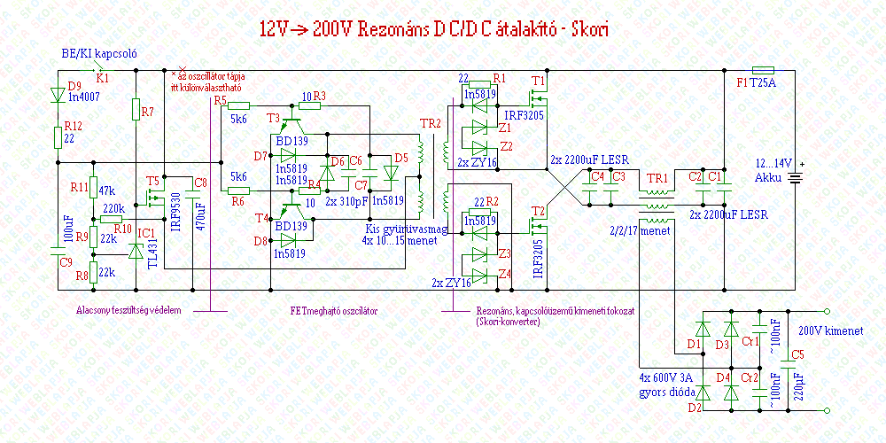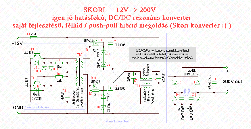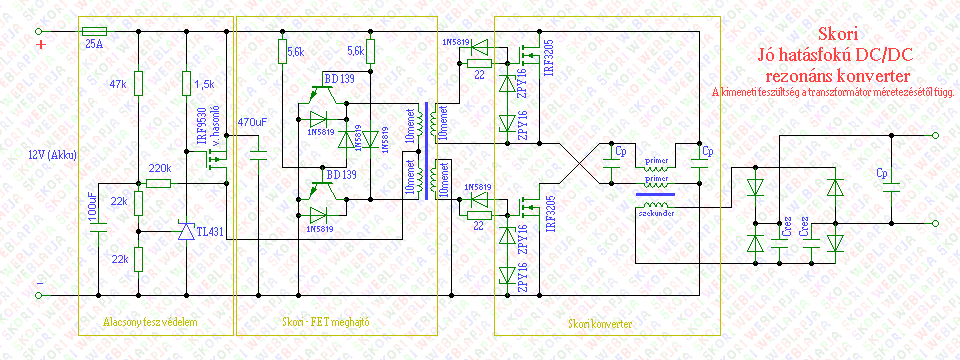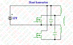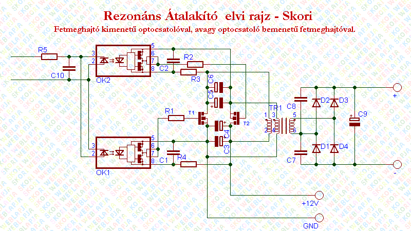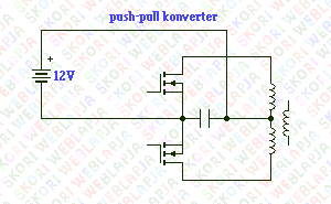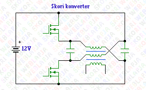 Skori konverter, ez egy kicsit átrendezve ugyanaz a rajz, mint az elõbb. Az elrendezést ránézésre olyan mint egy félhíd. Azonban megtartotta a push-pull elõnyeit. Ilyen kialakítás esetén már problémamentesen alkalmazható rezonáns megoldás is (szekunder oldali rezonáns kondenzátorokkal - melyek egyúttal feszültség-kétszerezõként mûködnek). A megoldás hátránya a fetek nehézkesebb meghajtása. Ez megkerülhetõ ha komplementer FET-párat használunk (egy N és egy P csatornás FET), ilyenkor egyszerû a meghajtás is, de megfelelõ paraméterû P csatornás FET nehezebben szerezhetõ be. A másik lehetõség a transzformátoros FET-meghajtás. Az elkészült deszkamodellben, ez utóbbi megoldást választottam... |